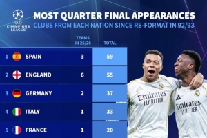 体育资讯3月17日讯 德国转会市场统计了1992-1993赛季欧冠改制以来各国球队晋级8强的次数,并列出榜单,西班牙59次最多,英格兰55次第二。