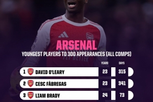 以下为阿森纳队史达成300场里程碑最年轻球员top5: