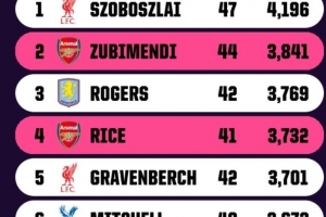 体育资讯4月17日讯 OPTA对英超球员本赛季各项赛事出场时间进行了统计,利物浦的索博斯洛伊以4196分钟居首,阿森纳两将苏维门迪和赖斯位居第2和第4位,两人出场时间分别为3841分钟和3732分钟。
